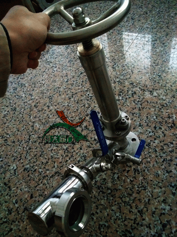 4、排氣口式真空取樣閥進出口為60度閥,形態(tài)如“Y”字。通常可稱Y型閥或角閥,也可屬于角閥中的一種特殊閥。此閥通常進口為外絲,出口為內(nèi)絲。但此閥采用進口法蘭式,出口卡箍連接方式。出口配衛(wèi)生級球閥及視鏡容器。精小形閥閥柱采用兩段T型槽連接,閥柱螺紋部與閥柱螺母相配,閥柱螺母靠螺紋旋緊在閥蓋上,然后用銷釘固定。閥桿和手輪連接,然后用螺母壓緊,這樣旋轉(zhuǎn)手輪就可以開啟或關(guān)閉閥門。